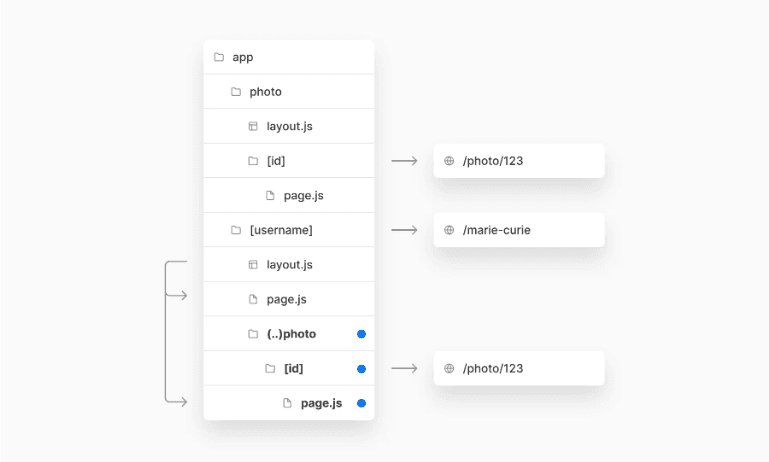 이를 구현하기 위해 예를 들어 /[username] segment에서 /photo/[id] 라우트를 intercept하기 위해서 /[username] 폴더 안에 (..) prefix를 가진 /photo/[id] 폴더를 만듭니다.
